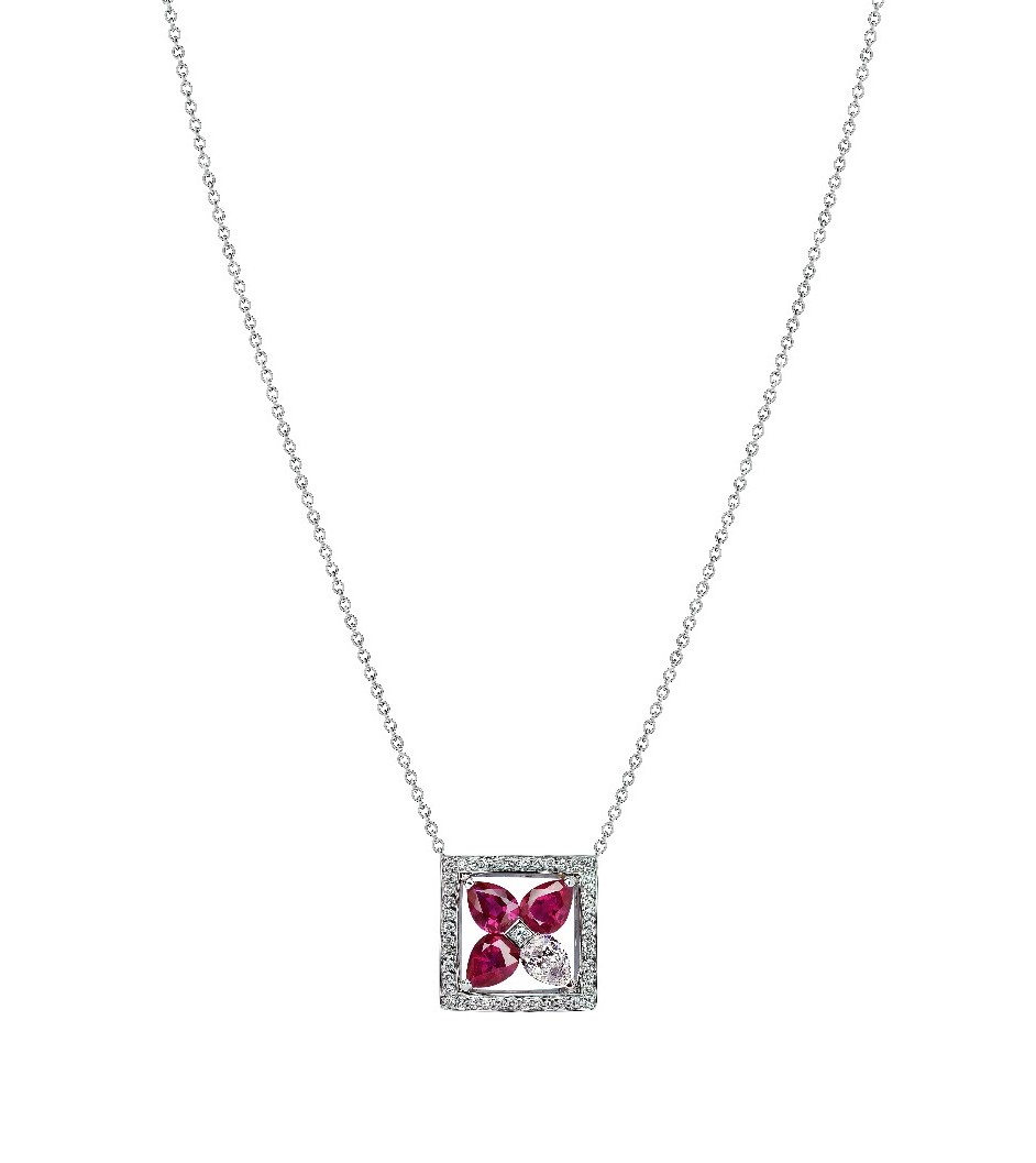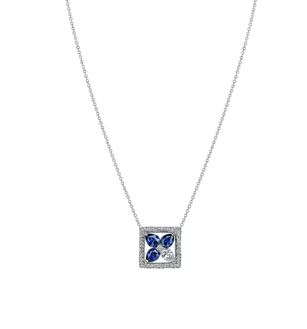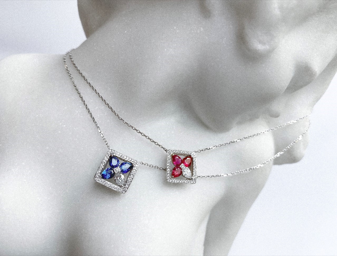 Semblant flotter sur un fond ajouré pour mieux laisser les gemmes briller, la chaine en or blanc arbore quatre pétales aux reflets chatoyants. Ce carré « Précieux » orné d’un diamant, irradiant de lumière, dans un jeu de contraste, flatte les trois autres parés de rubis ou de saphirs.