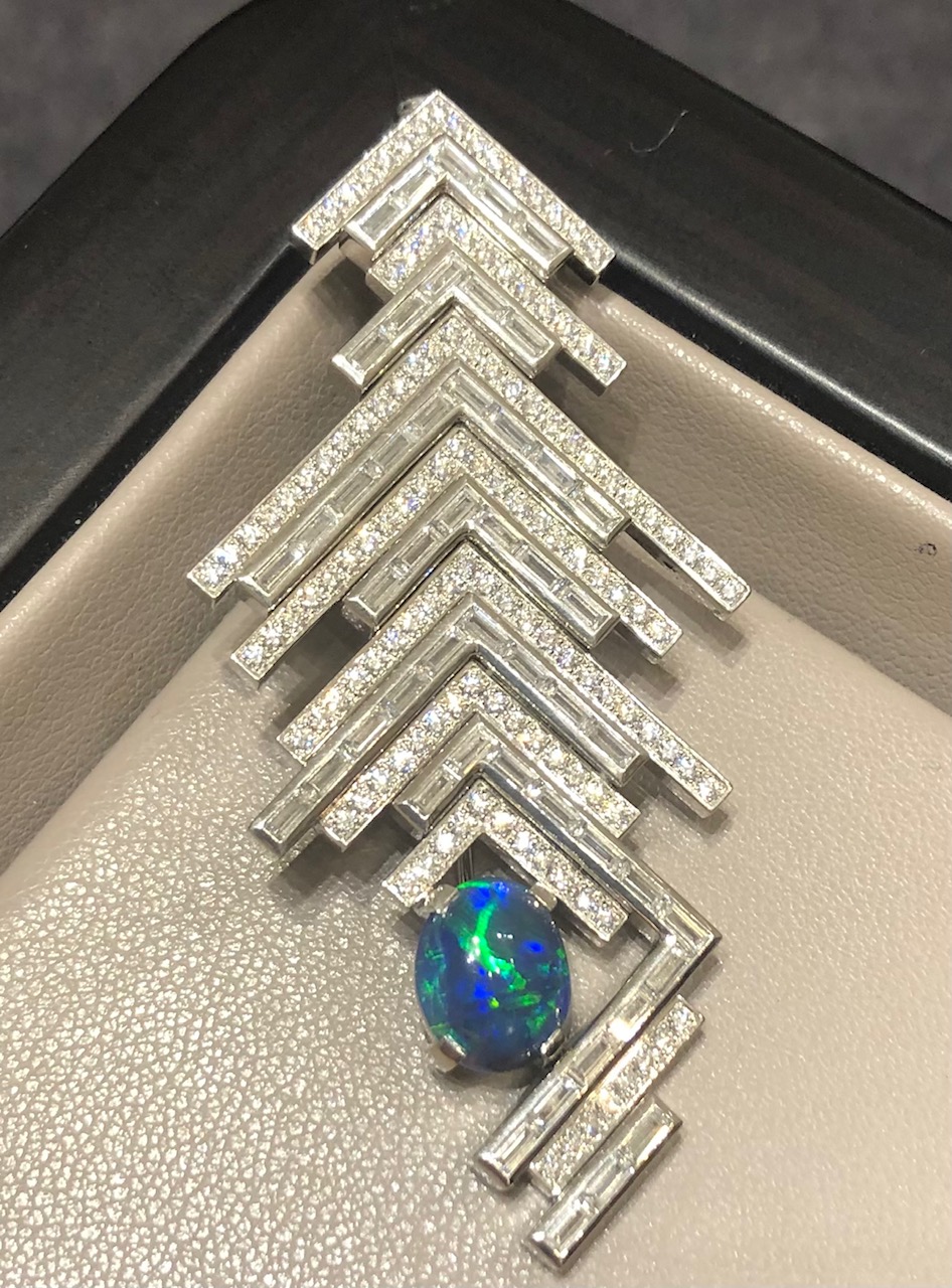 On dit que les opales renferment le secret des rayons de la lune, celui de leur douce lueur, capturée dans la pierre. Cette magnifique broche reprend cette association pour la traduire en un design artistique, qui rappelle l’esthétique intemporelle de l’Art Déco.