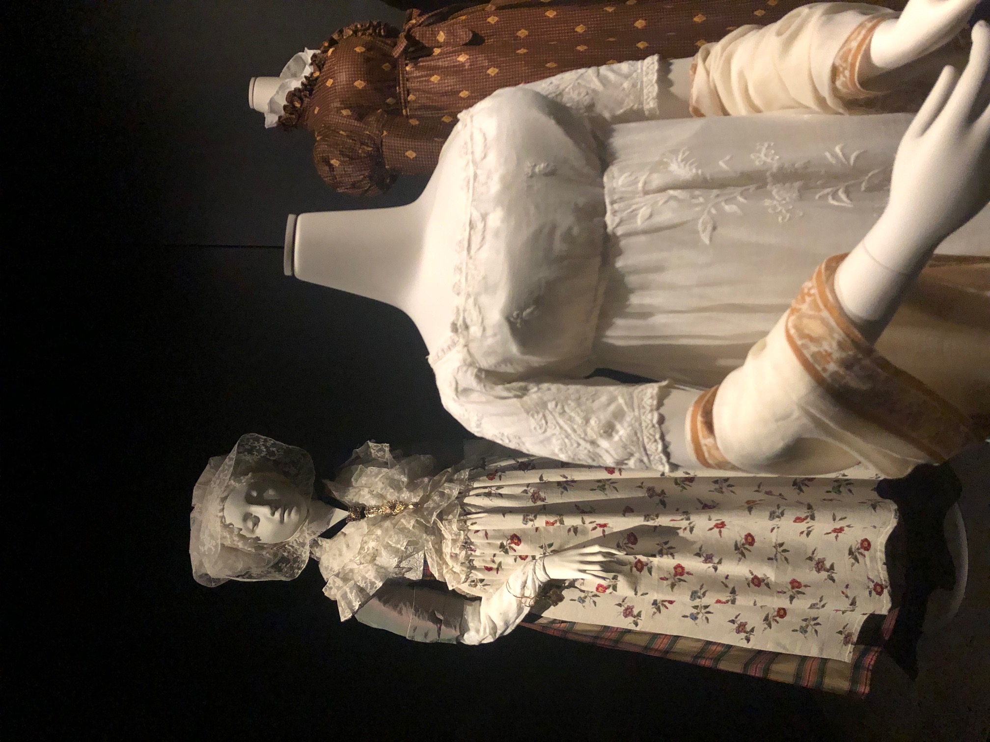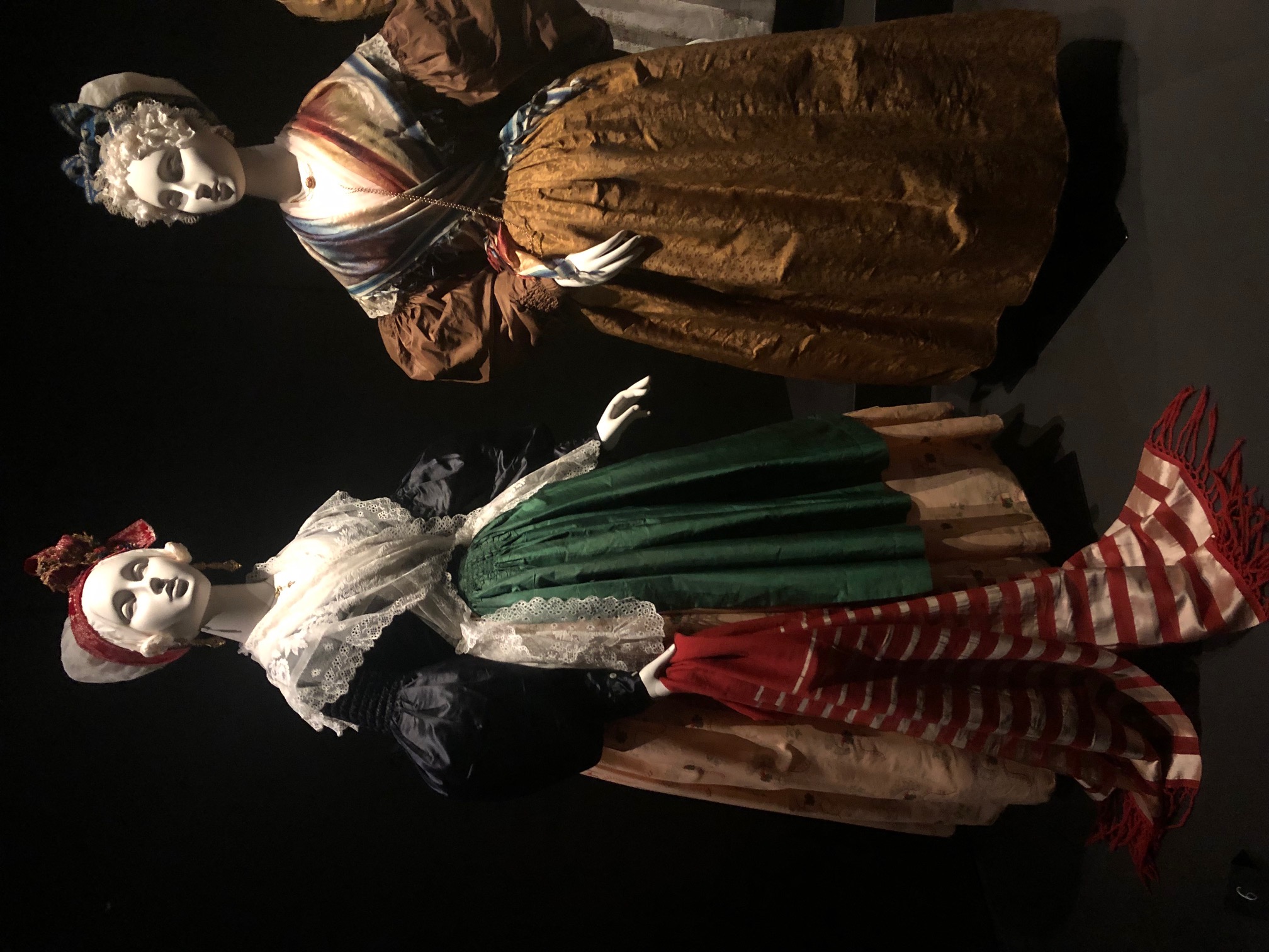 2/ A droite, Arlésienne en tenue de fête vers 1820 - au milieu, Robe française à traine et étole imprimée, vers1803 - 1805, à droite, Robe française rodingotte imprimée vers 1815.