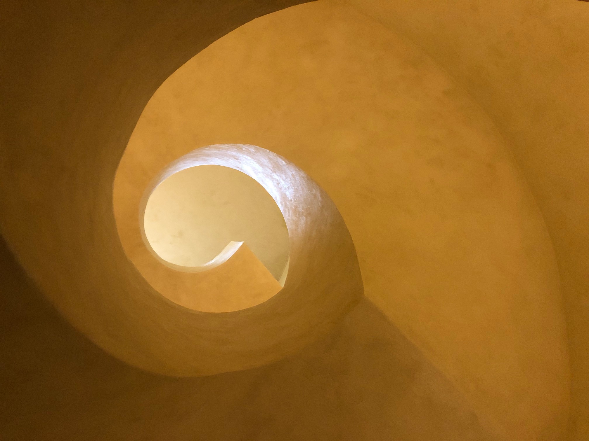 1/ Escalier d'époque restauré, drapé dun tissu de coton rappelant les voiles des bâteaux transportant les tissus débarqués à Arles via le Rhône.