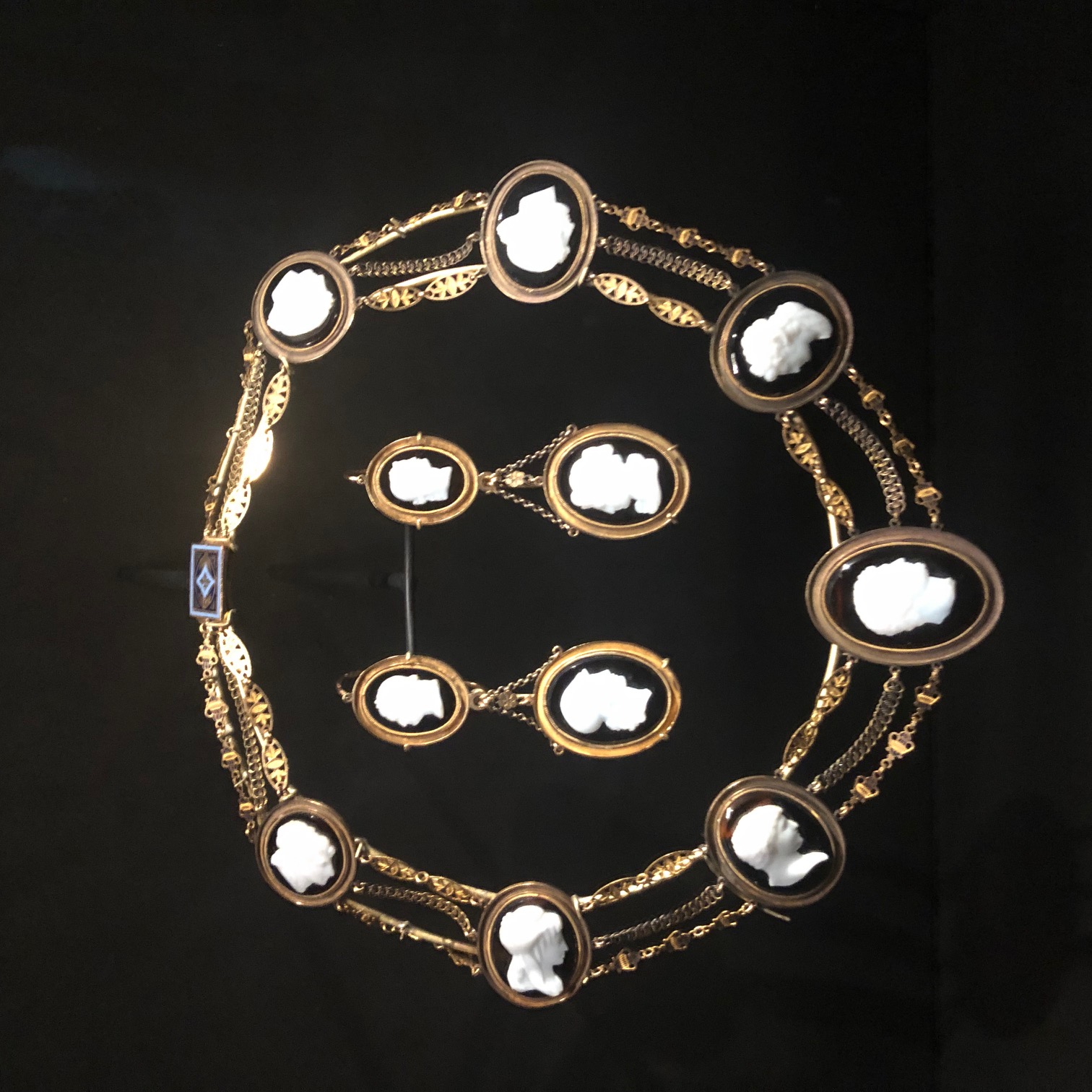 Visuel : ©mildred-forman pour ATTITUDE Luxe - Musée de la Mode et du Costume, Arles. - Bijoux provençaux, parure camées, présenté dans le cabinet de curiosité du musée.