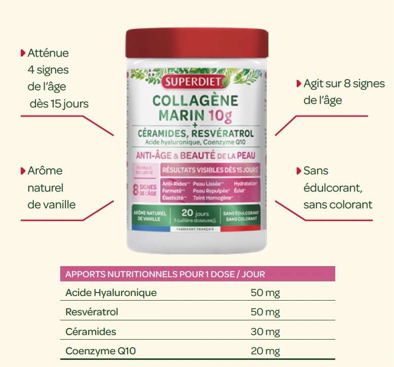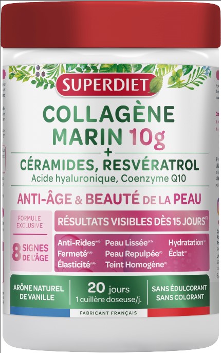 SUPERDIET a lancé quatre références de collagène marin ciblés, dont 1 anti-âge & beauté de la peau, sa formule contient du collagène marin Naticol® et des céramides de blé CéramosidesTM, combinant les bienfaits des actifs végétaux et marins pour une prise en charge globale des marqueurs de l’âge : anti-rides, élasticité, fermeté, éclat et douceur de la peau.