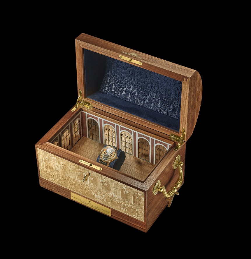 Le coffret contenant la montre Montblanc Star Legacy Suspended Exo Tourbillon Château de Versailles a été créé par Elie Bleu, maison spécialisée dans la tabletterie de luxe, fondée en 1976. La boîte à musique qui se trouve à l’intérieur a été créée par la Manufacture Reuge, en Suisse, spécialisée dans les luxueux mouvements à musique mécanique et à oiseaux chanteurs depuis 1865. Le coffret permet d’entendre la musique jouée à Versailles pour célébrer le mariage du Dauphin Louis et de son épouse lors de cette fameuse nuit de février 1745.