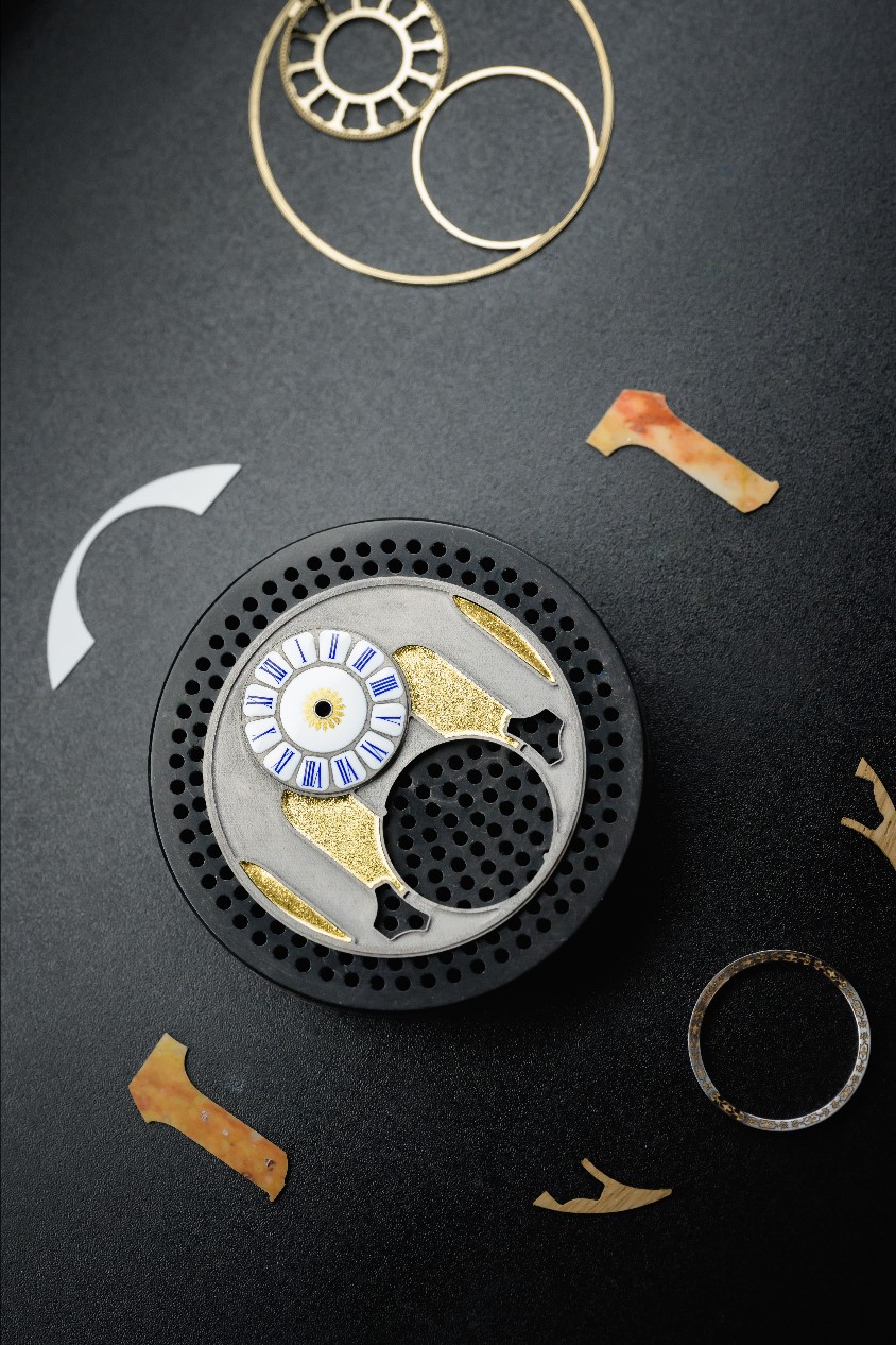 La base du cadran confectionnée en or blanc 750/1000 (18 carats) a été recouverte d’émail noir et parsemée de paillons dorés avant la cuisson au four. L’émaillage et le revêtement en or imitent l’effet produit par des chandeliers couverts de bougies se reflétant dans des fenêtres, ce qui donne une profondeur intéressante au cadran. Les arches sont conçues avec deux types de pierre : du cacholong, une variété d’opale d’un blanc laiteux, et du marbre de Sarrancolin provenant de la carrière du même nom dans les Hautes-Pyrénées, qui fut utilisé pour la galerie des Glaces du château de Versailles. Le sol est réalisé avec du chêne massif découpé et incrusté dans le cadran pour reproduire le motif du parquet. Tous les matériaux utilisés pour confectionner la base du cadran présentent des variations