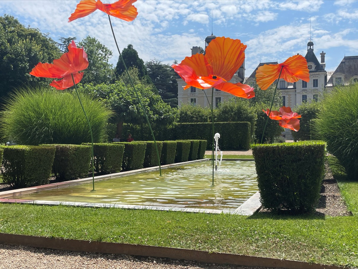 Le château de Cheverny est devenu l'un de ses terrains d'expression privilégiés. Après une cinquantaine de coquelicots géants (jusqu'à 6,50 m de hauteur) installés à l'été 2024, puis des alliums monumentaux à l'automne 2025, c'est donc la tulipe qui devient en 2026 le nouveau chapitre de cette collaboration artistique avec Constance et Charles-Antoine de Vibraye, propriétaires du Château de Cheverny.