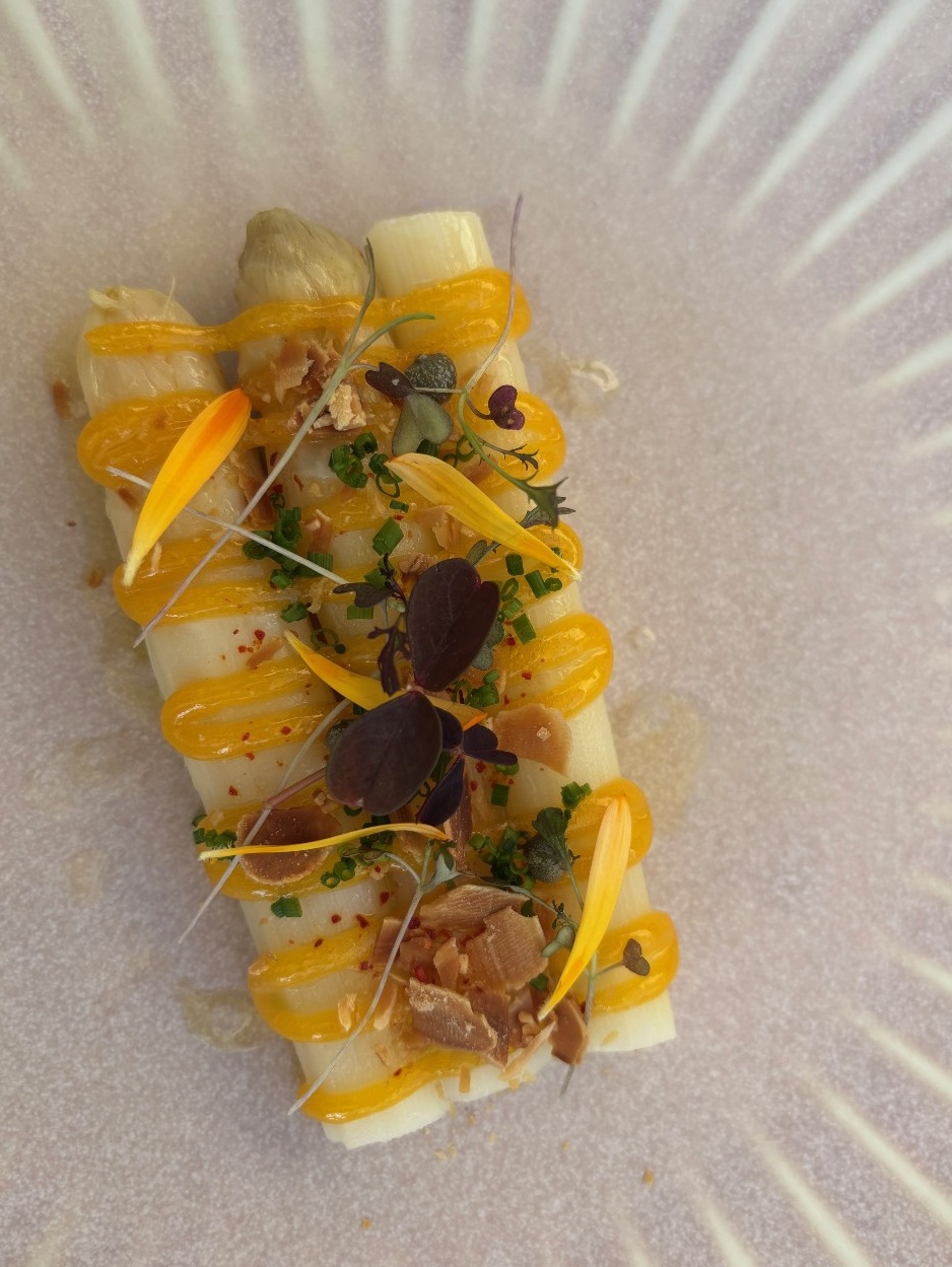 Visuel©Mildred Forman. Entrée du menu du midi 49 € en semaine de la Belle Vie - Asperges le 20 03 26.