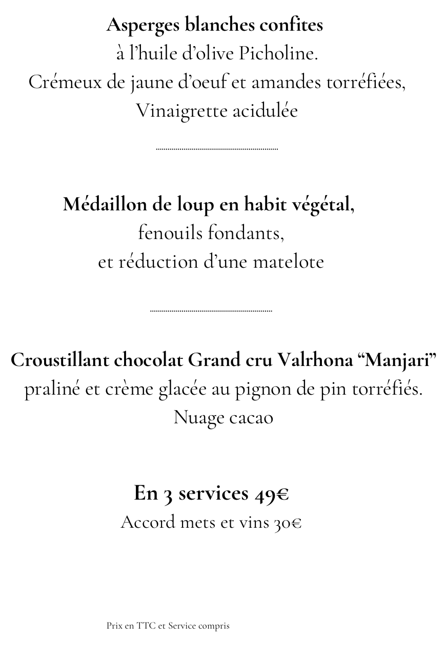 Le Midi (sauf le samedi) menu 49 € : Amuse-bouche, entrée, plat, dessert. (Hors boisson).