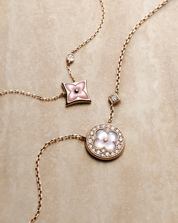 Dans sa quête de raffinement et de modernité, Color Blossom exalte la beauté des pierres avec, pour la première fois, cinq créations au serti or pavé de diamants : deux pendentifs, une bague Star au design affirmé et deux médaillons ajustables en nacre rose ou en malachite, tous ornés d’un diamant central. Une variation précieuse rendue possible grâce à un polissage méticuleux de la surface afin d’obtenir l'angle idéal pour réaliser ce pavage complexe, subtil et organique. Réalisé à partir de diamants de toutes tailles, il encadre délicatement le motif, exalte le contraste des Fleurs de Monogram et amplifie la profondeur de chaque pierre.